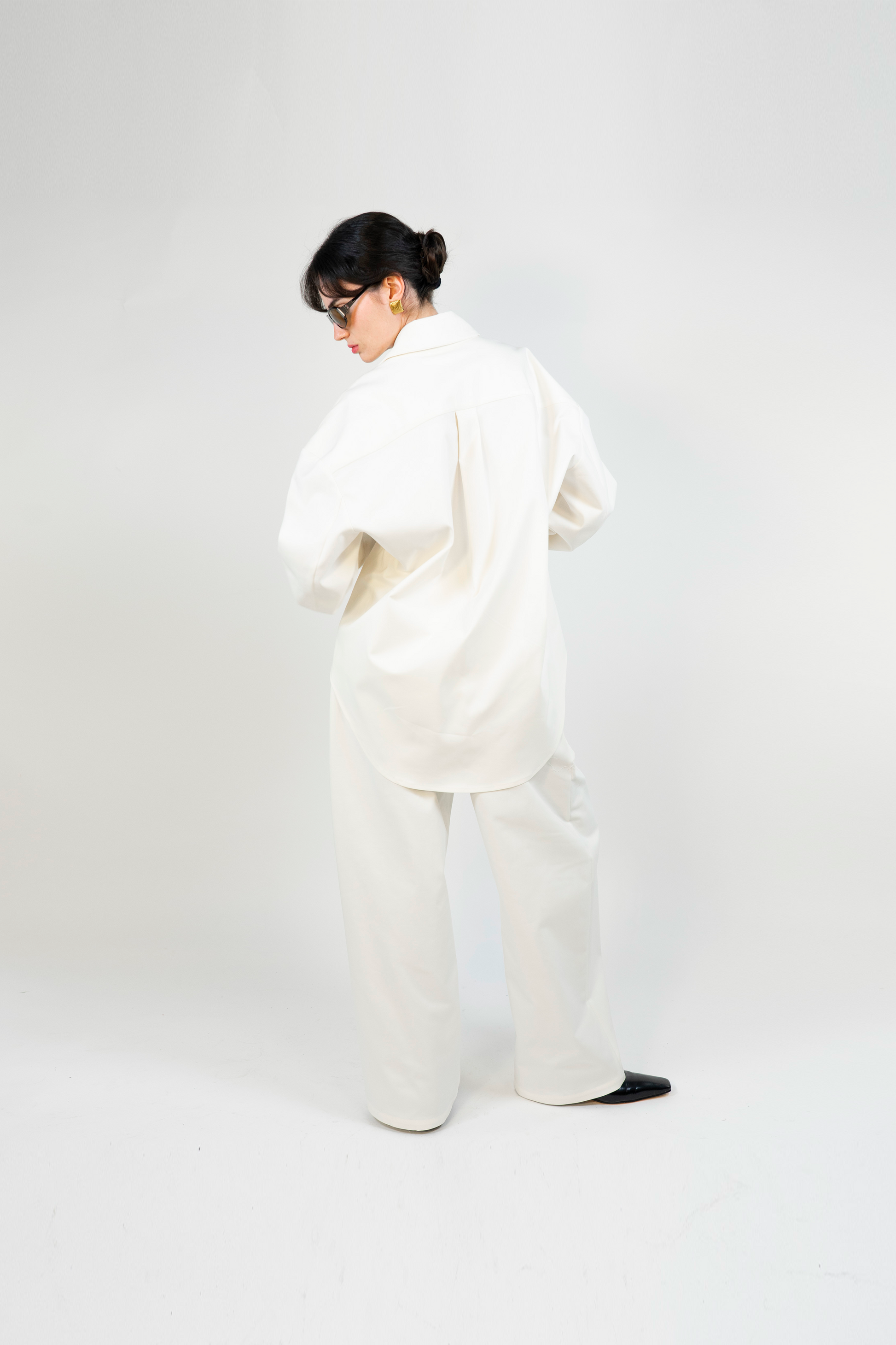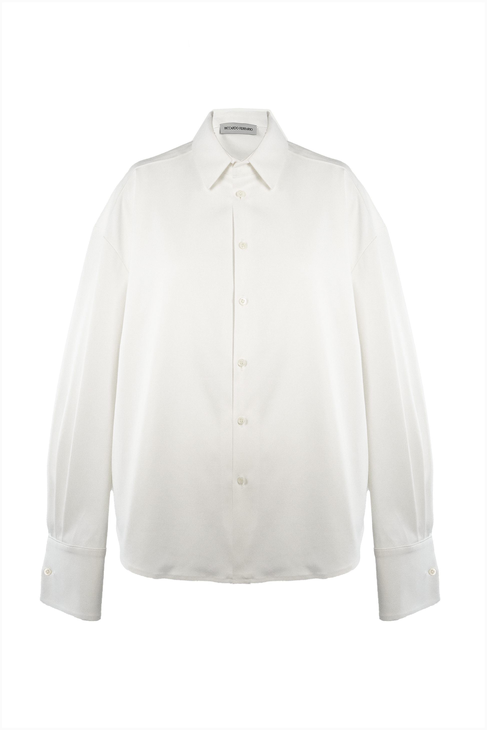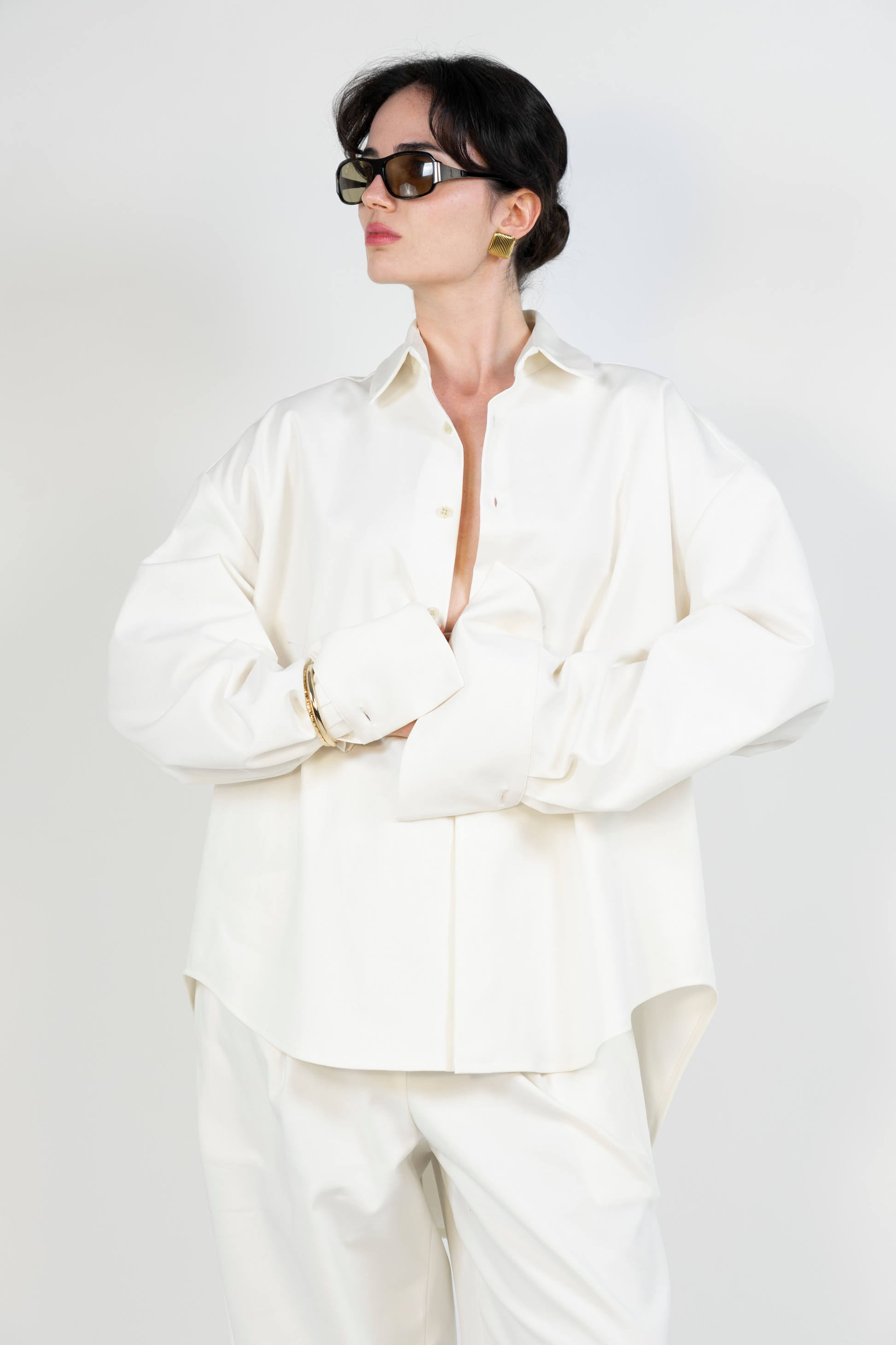 The Boyfriend shirt in white cotton features an oversized fit, a pointed collar, and a back yoke with central pleat. Long sleeves finish with exaggerated cuffs and shirt buttons. One size.