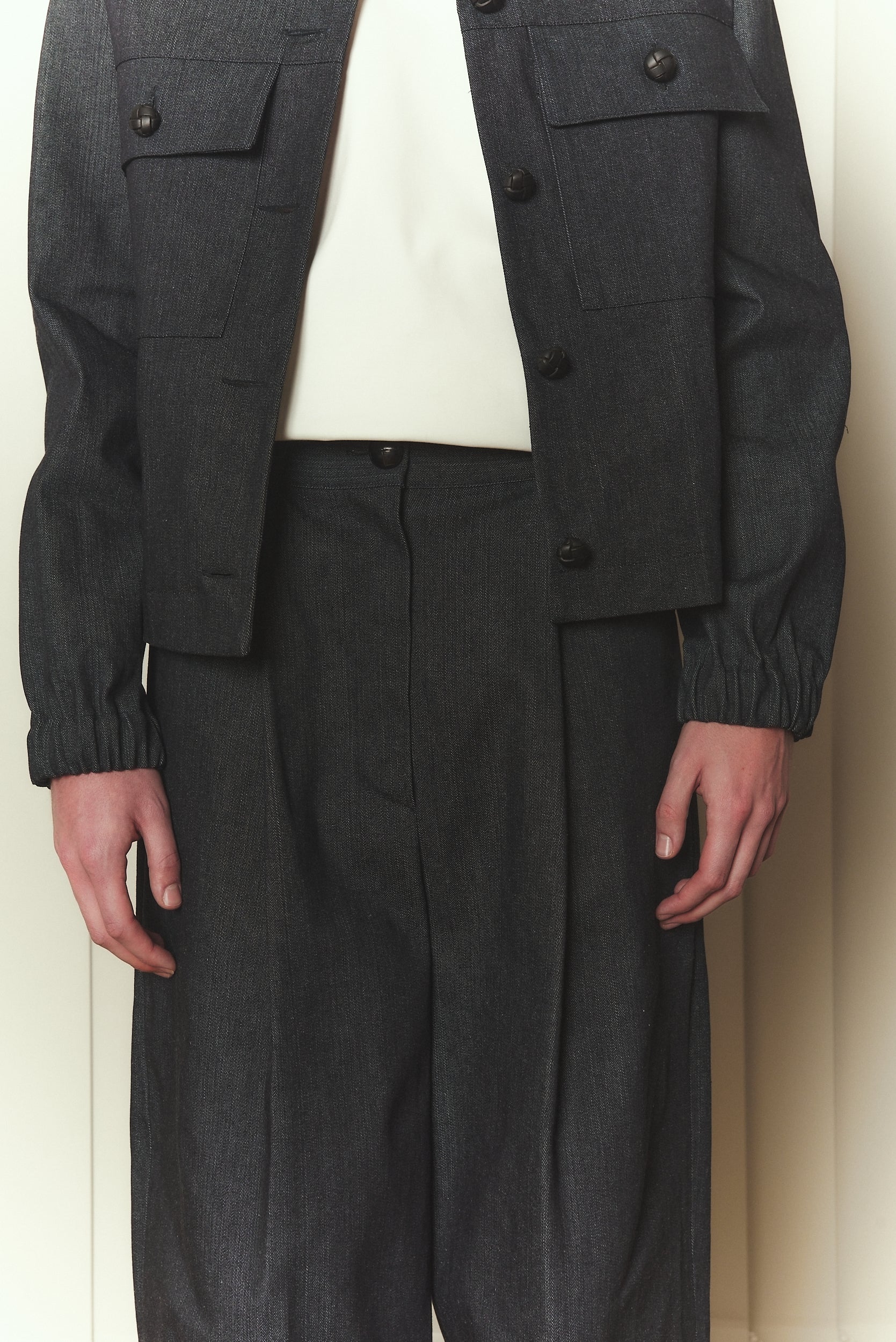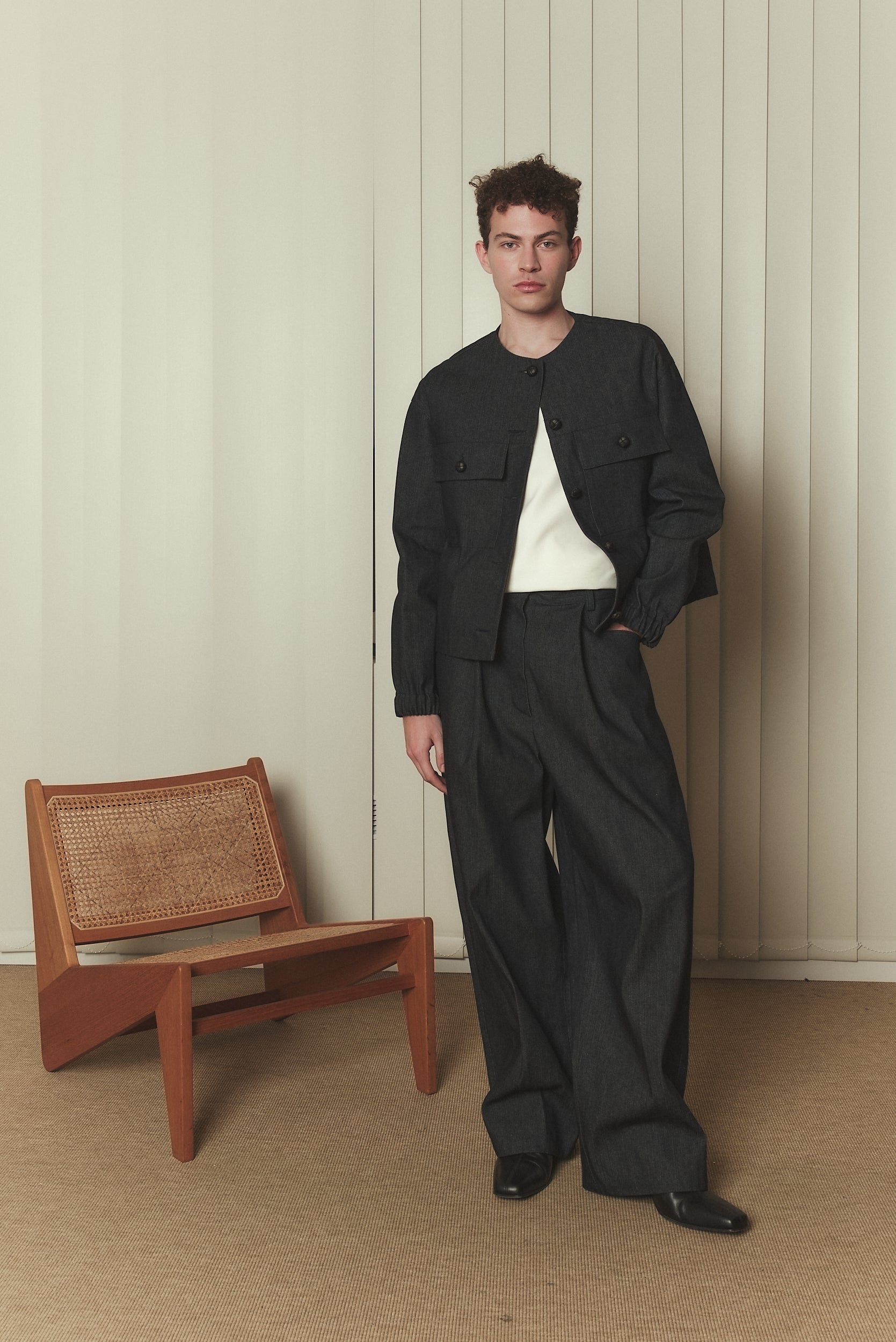 The Concierge jacket is made from japanese denim in a relaxed, oversized fit. Inspired by classic workwear, it features a crew neck, central closure with loden buttons, and practical patch pockets. Elasticated cuffs add a subtle touch of volume, blending utility with comfort. A one-size, genderless design made to adapt—fluid, functional, and unapologetically versatile.