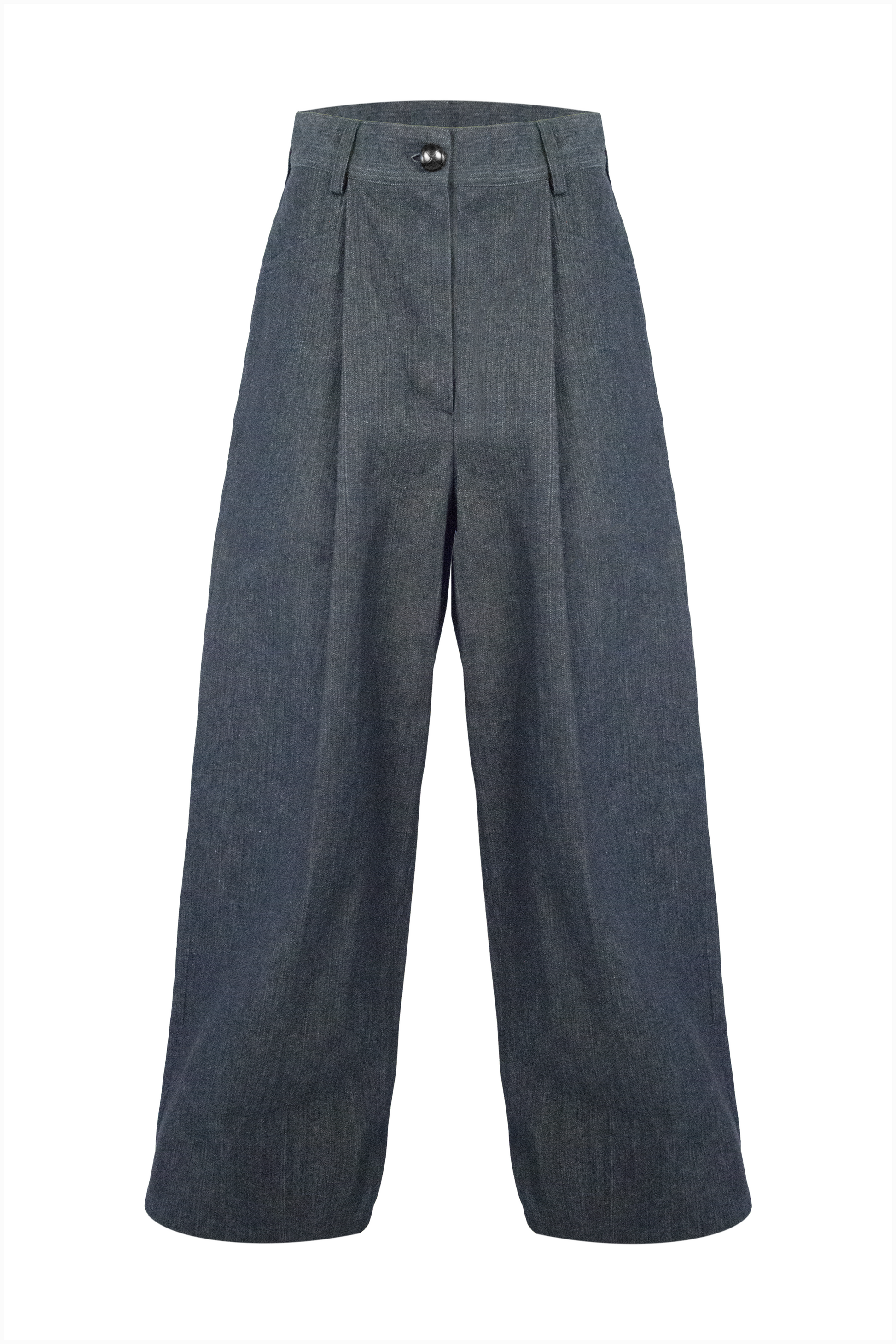 The Earhart trousers are cut from structured denim with a loose fit. A bold front pleat defines the silhouette, while tailored details—like the squared American-style pocket, belt loops, and a Loden-buttoned waistband—recall timeless utility. Designed to move with ease between masculine and feminine codes, they offer freedom in both form and attitude.