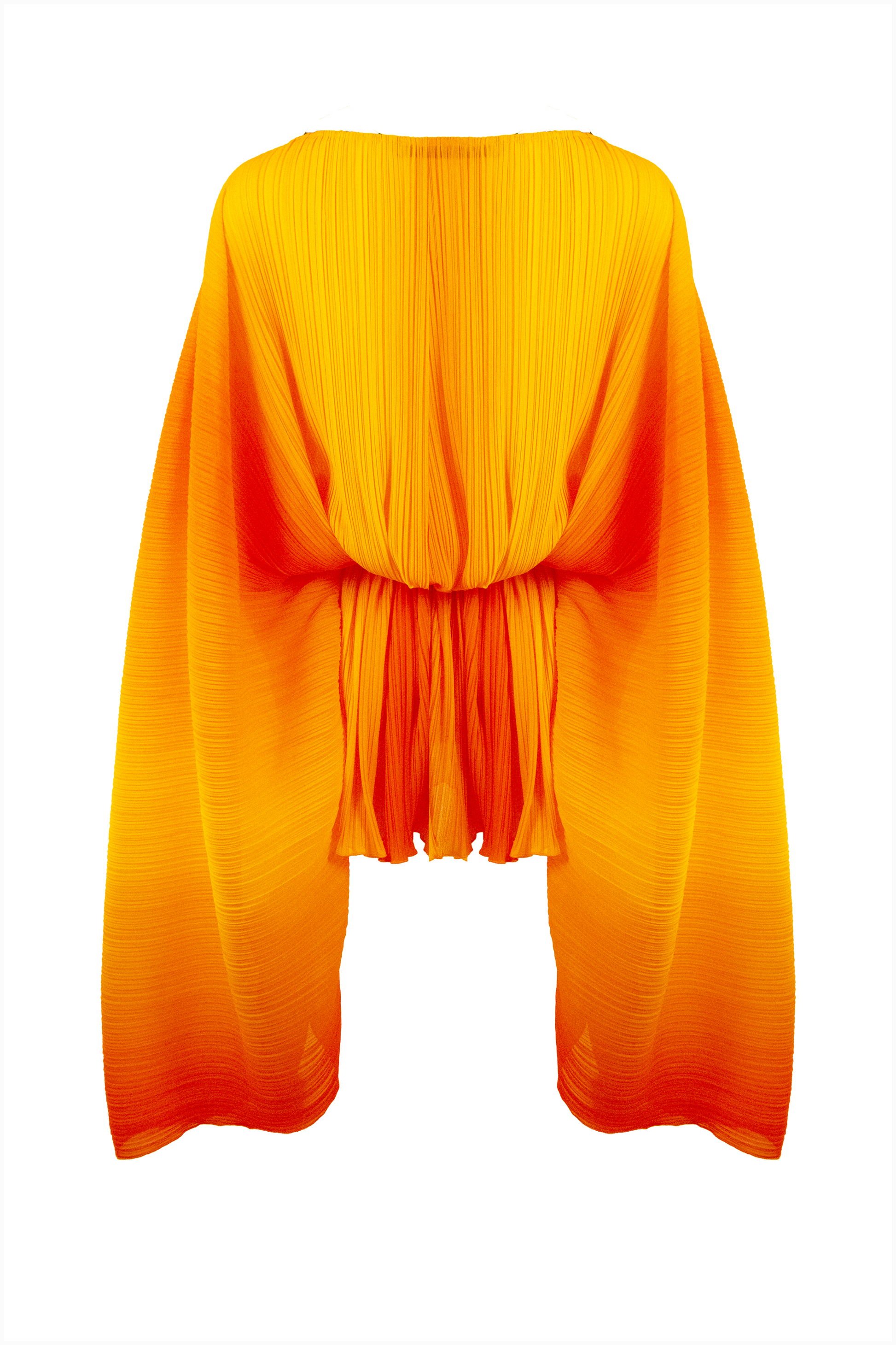 The Kimono mini dress (or tunic) in poppy plissé features long sleeves inspired by Japanese tradition and a belt that defines the waist. With its loose, one-size fit, it adapts gracefully to different silhouettes, balancing essential simplicity with understated elegance.